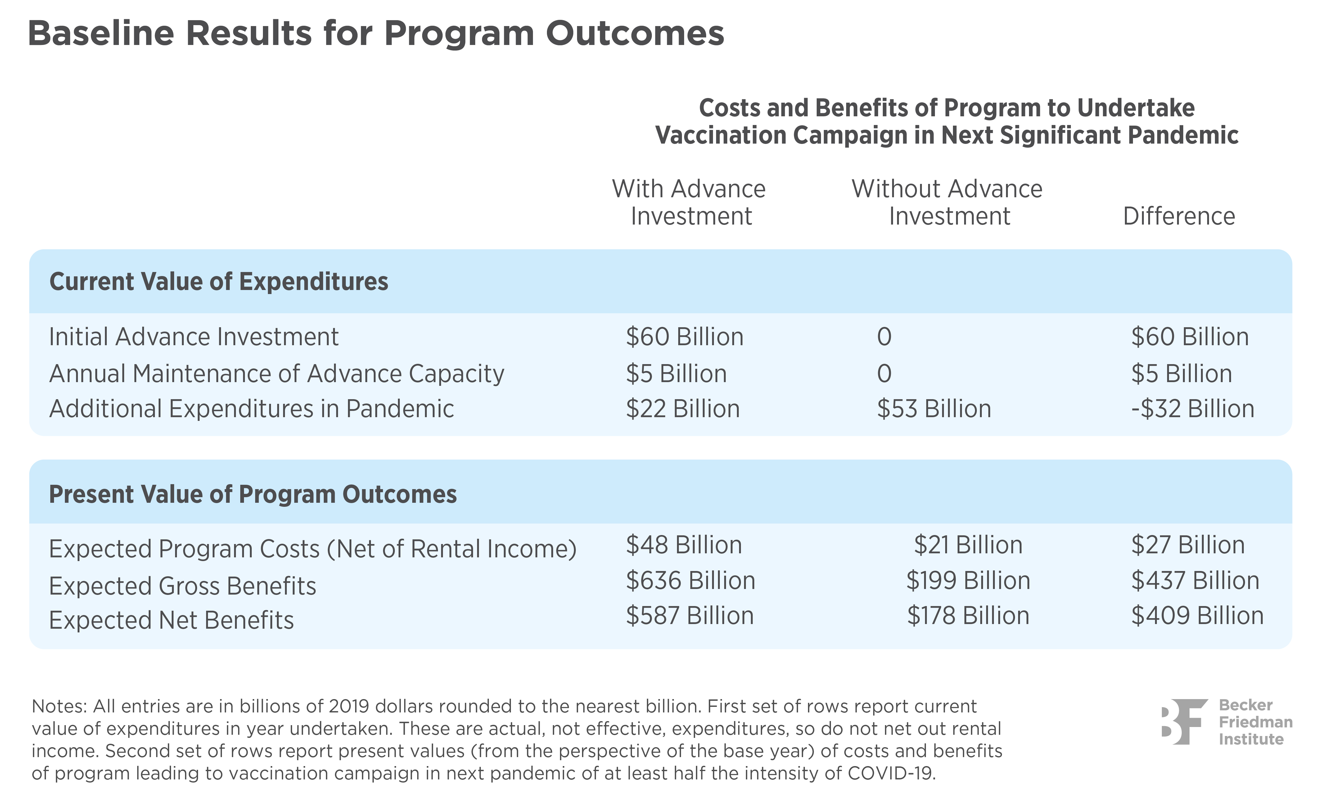 What to do? Advances in vaccine technology, such as mRNA vaccines, have increased our ability to rapidly develop vaccines for new diseases although traditional vaccine technology also remains powerful. Putting additional vaccine production capacity in place now so that we can rapidly produce new vaccines would sharply reduce the time until sufficient vaccines were available worldwide, saving both lives and livelihoods. Specifically, spending $60 billion to expand production capacity for vaccines and supply-chain inputs, and $5 billion annually thereafter to maintain these facilities, would guarantee production capacity to vaccinate 70% of the global population against a new virus within six months, generating an expected net present value (NPV) of over $400 billion. If the United States went it alone with contracts to firms to build capacity and agree to turn it over to pandemic production would generate benefits (net of program costs) of $47 billion or $141 per capita just from the next significant pandemic.