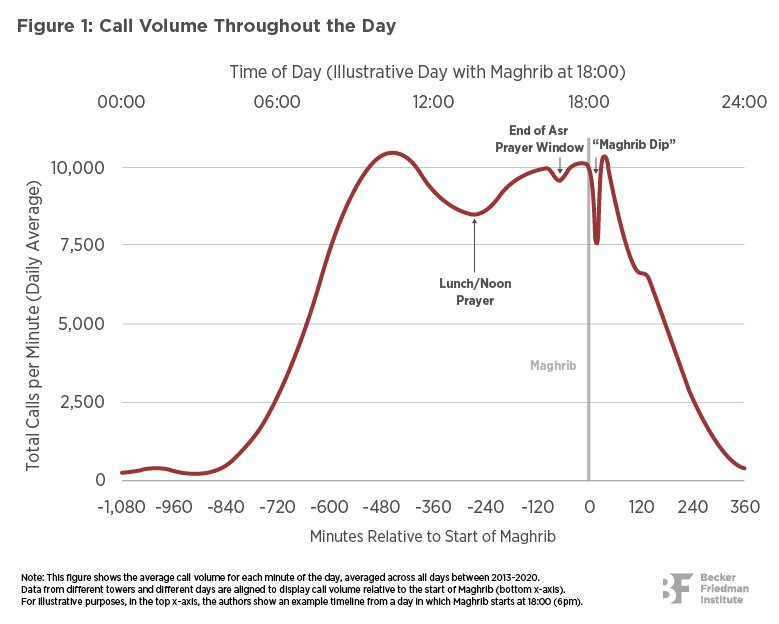 - There is a substantial decrease in call volume immediately following the start of the Maghrib window. Across Afghanistan, on average, call volumes drop by roughly 25% about 15 minutes into the Maghrib prayer window, which the authors coin as the “Maghrib dip.” (See Figure 1)