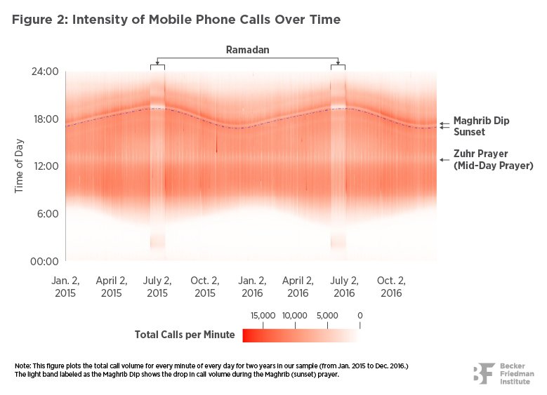 The paper contains both a methodological and applied section, which are briefly described in this Economic Finding (please see the full working paper for more details). In the methodological section, the authors employ anonymized mobile phone data from one of Afghanistan’s largest mobile phone operators to measure religious adherence based on the volume of call drops during the evening Maghrib (sunset) prayer window. Talking to others, including on the phone, is widely considered to invalidate prayer, and the Maghrib prayer window is well-suited to this task because it is short and well-defined, and because it occurs during a time when people are awake and otherwise active. Based on data from nearly 10 million unique phone users and 22 billion phone calls from 2013-2020, the authors find the following: